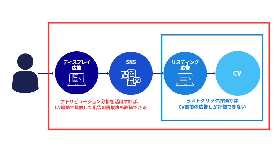 一方、アトリビューション分析を活用すれば、ラストクリック以前にユーザーに接触しているディスプレイ広告やSNSの貢献度も含めて施策の効果を測ることが出来るため、より正確な評価をすることが出来るようになります。