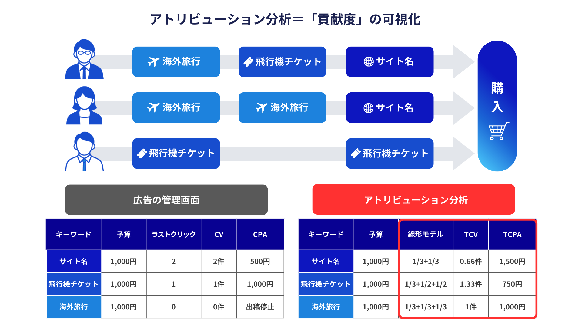 アトリビューションを活用すれば、複雑なユーザー行動を可視化して、各広告やメディアがコンバージョンにどの程度貢献したのか明らかにすることが出来ます。