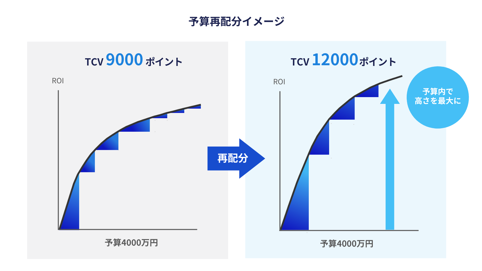 上記のようにCV貢献度を可視化することで、ROIの低い施策から高い施策へ予算配分を行うことができるため、マーケティング予算をより効率的に活用し、高いROIを実現できます。