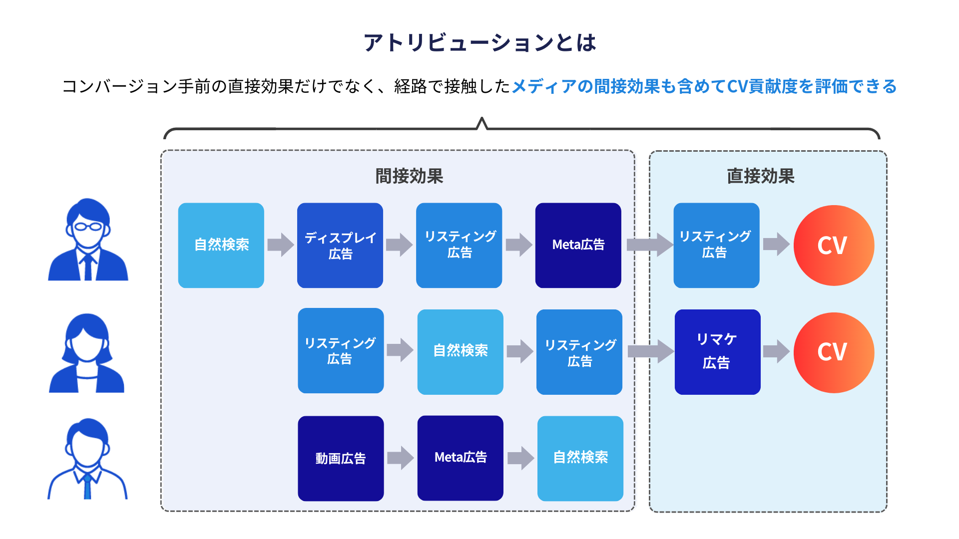 通常、CVの直前に接触するメディアはリスティング広告や指名検索などが一般的ですが、アトリビューションを活用すれば、CVに直接効果を与えた施策だけでなく、間接効果も含めて貢献度を評価することが出来ます。