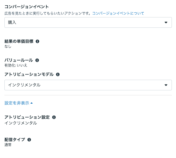 広告セット作成時に、コンバージョンのアトリビューションモデルを選択できます。設定内容に応じて広告配信の最適化が行われるため、単なる計測ではなく運用成果にも直結する重要なポイントです。